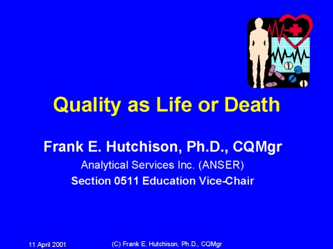 Quality professionals have little trouble in describing how quality can be a benefit on the job, but what about the rest of your life? Does quality have a benefit outside the work place? Frank Hutchison will describe how quality concepts and tools are used to affect matters of life and death in everyday life and how individuals can use them to improve their health and well-being.